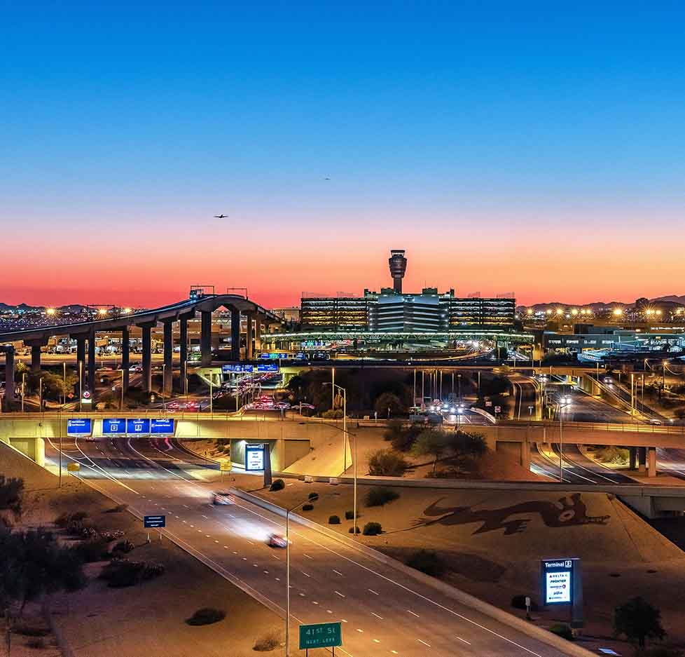 Du landest in der Regel am Phoenix Sky Harbor International Airport (PHX) – einem der verkehrsreichsten Flughäfen der USA. Der Flughafen liegt zentral, nur ca. 10 km von Downtown entfernt.